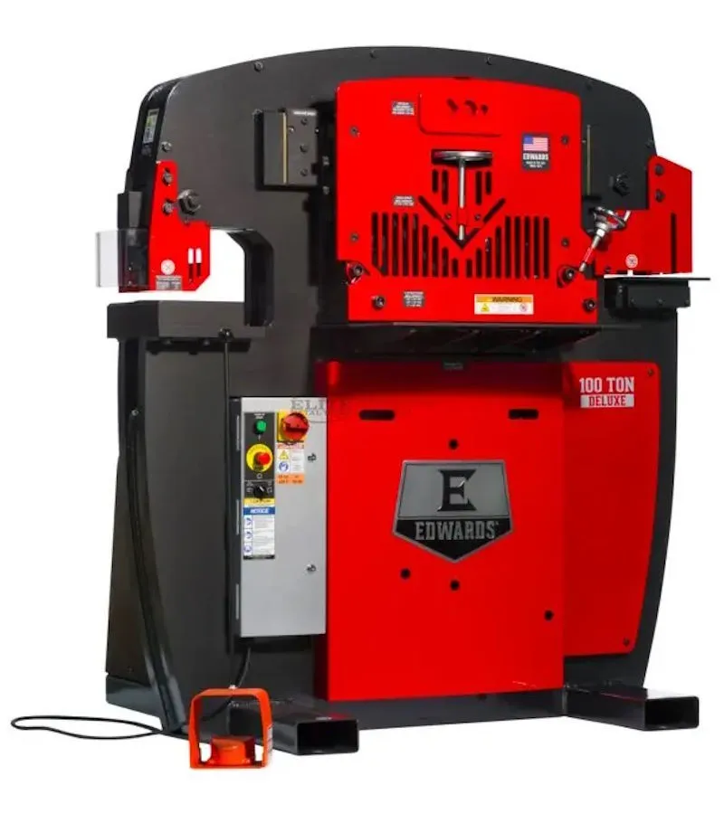 Our 100 Ton Ironworker provides optimal power and adaptability to handle any project with its four workstations, 13 interchangeable attachments in the open workstation, and 17 accessories to adapt the Ironworker to your needs. Ideal for larger fabrication shops or those jobs requiring heavier materials, this compact machine that allows for fast and easy transitions between fabrication operations: punch, shear, notch, bend, or cope all in one machine. The Angle Shear blades have 2 corner radii and are made of precision tool steel with 2 cutting edges, while the Flat Bar Shear blades are made of precision machined, high-quality tool steel with 4 cutting edges. The Powerlink™ System increases your capabilities by turning your Ironworker into a power source for our line of Hydraulic Tools.